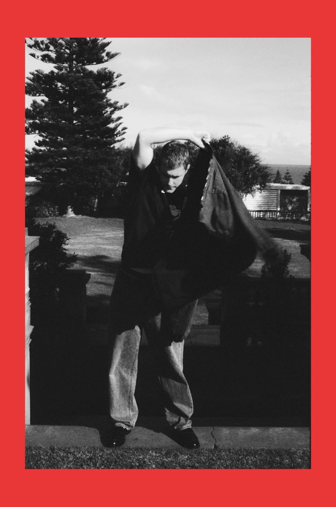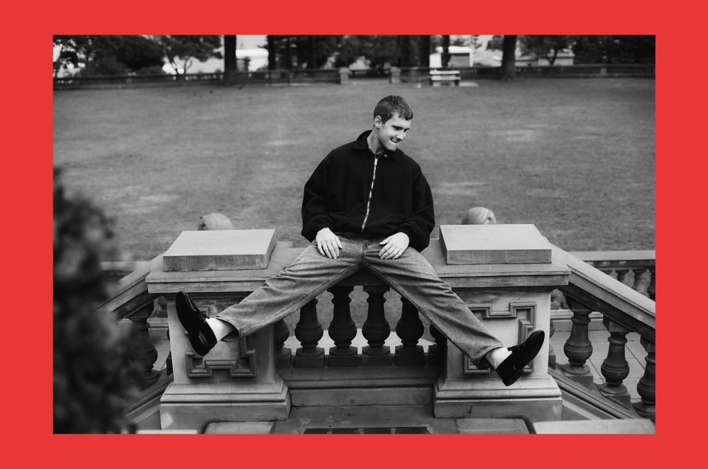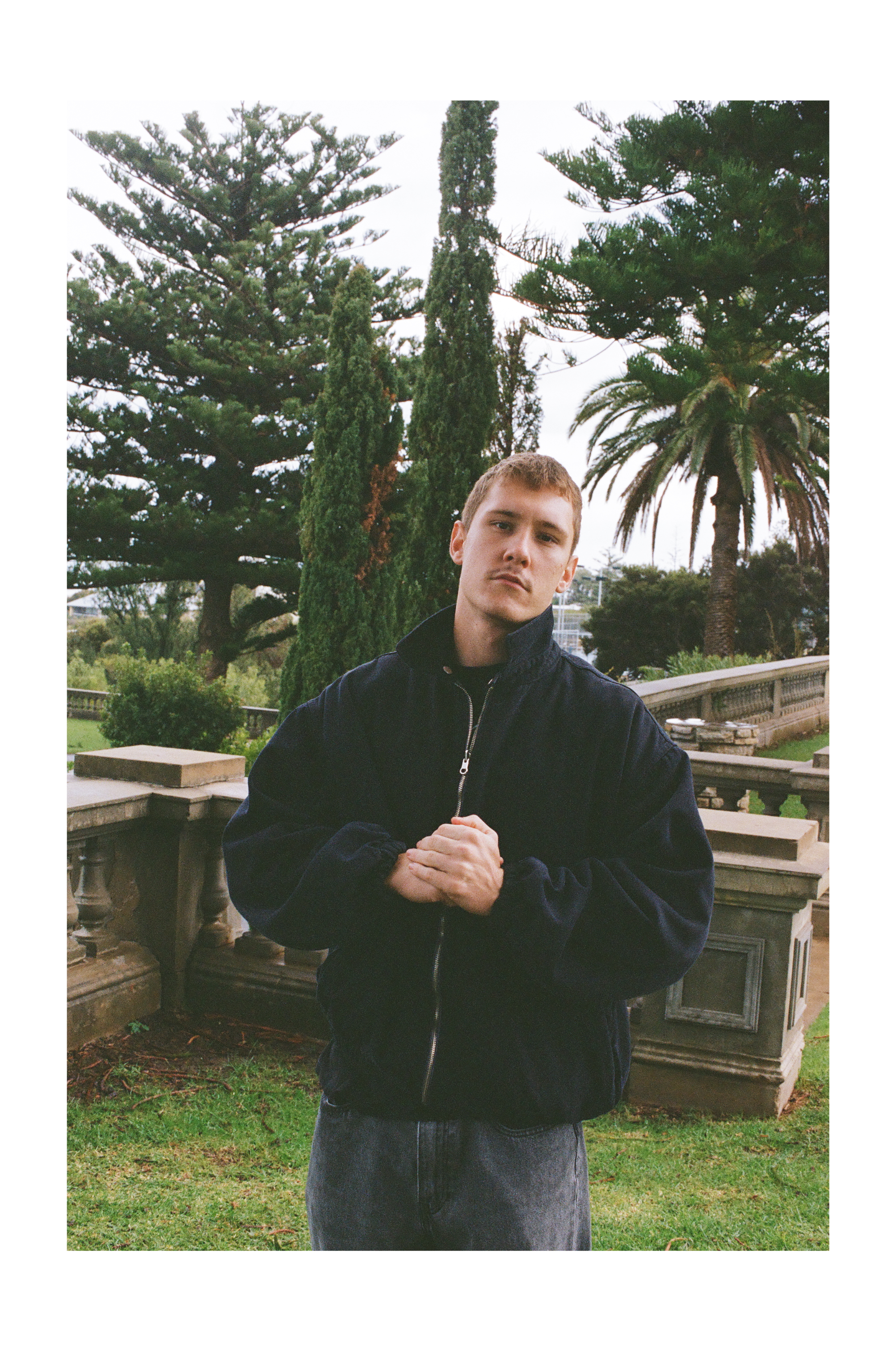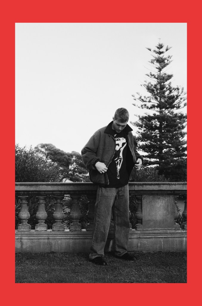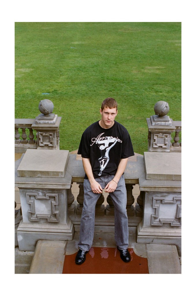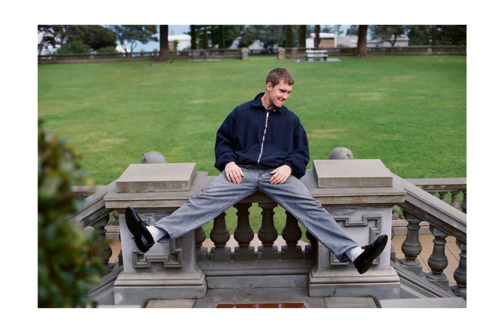 Shot outdoors in a public park, focusing on fit, proportions, and garment details in natural light. no post production, analogic.