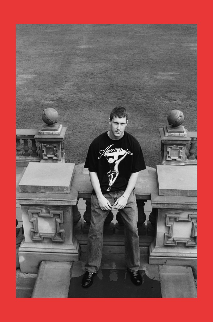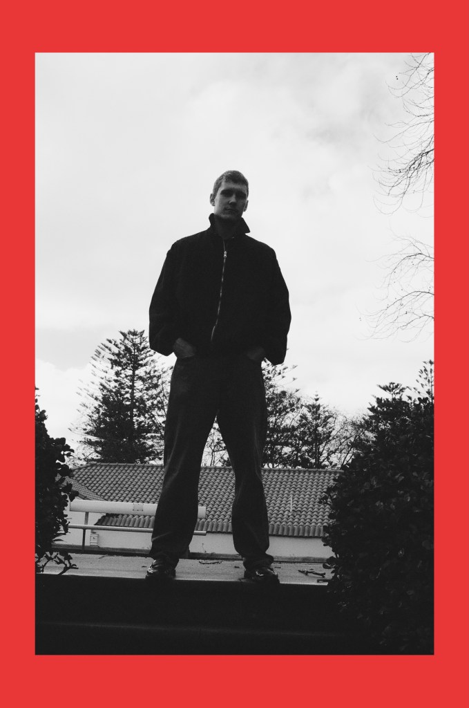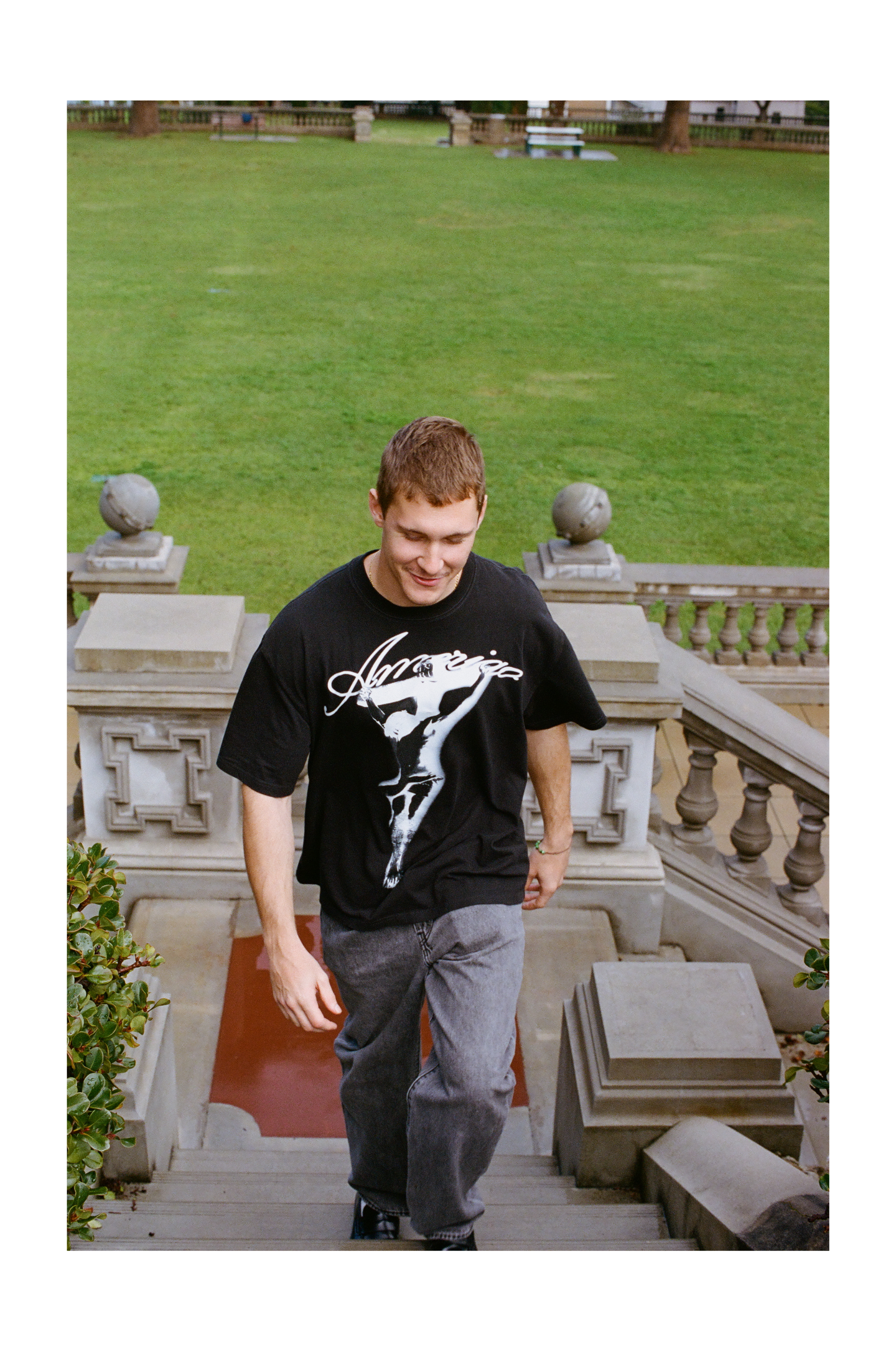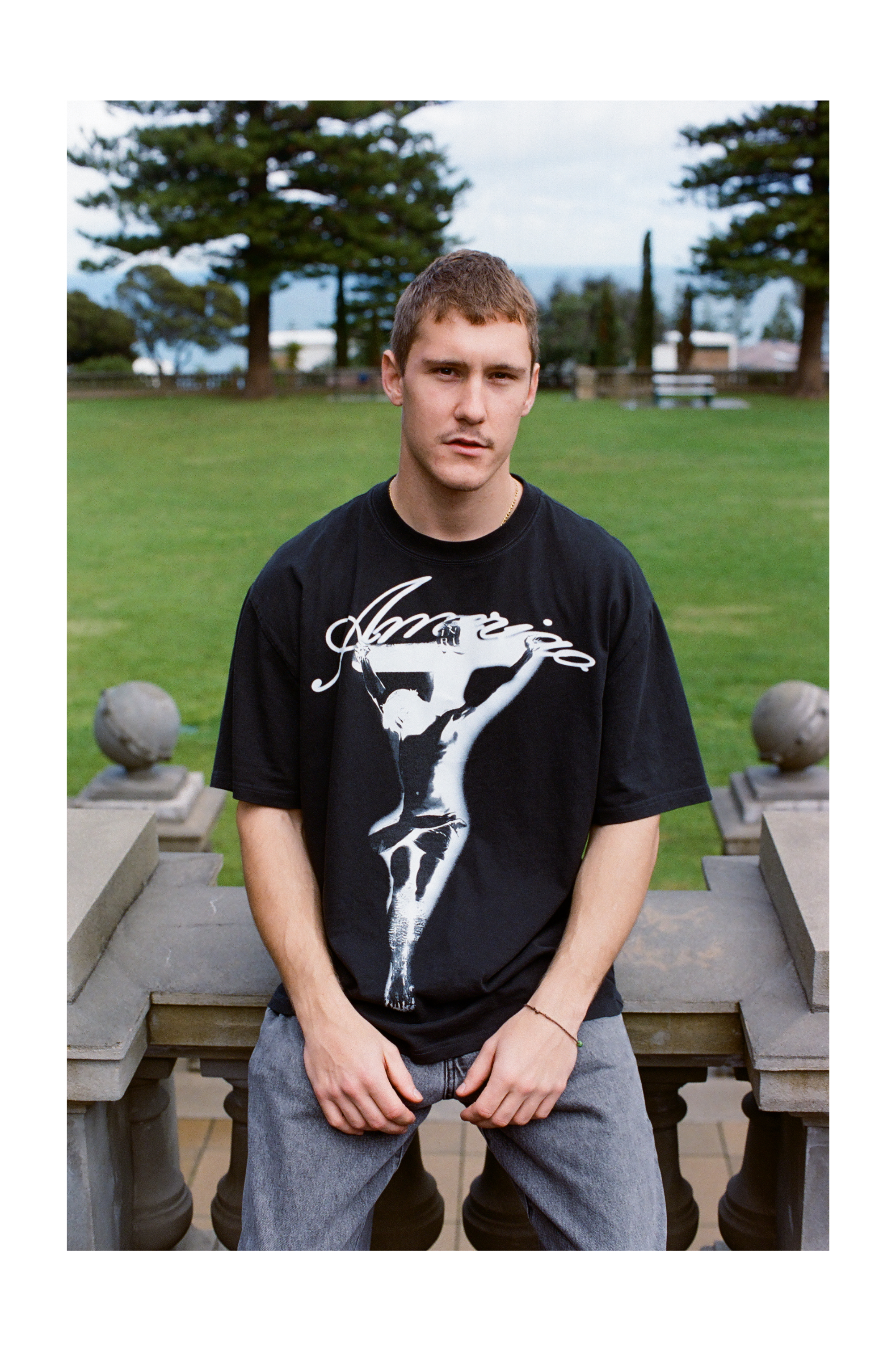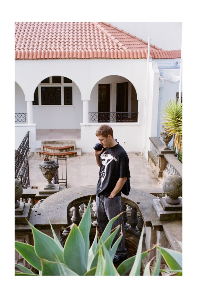 Shot outdoors in a public park, focusing on fit, proportions, and garment details in natural light. no post production, analogic.