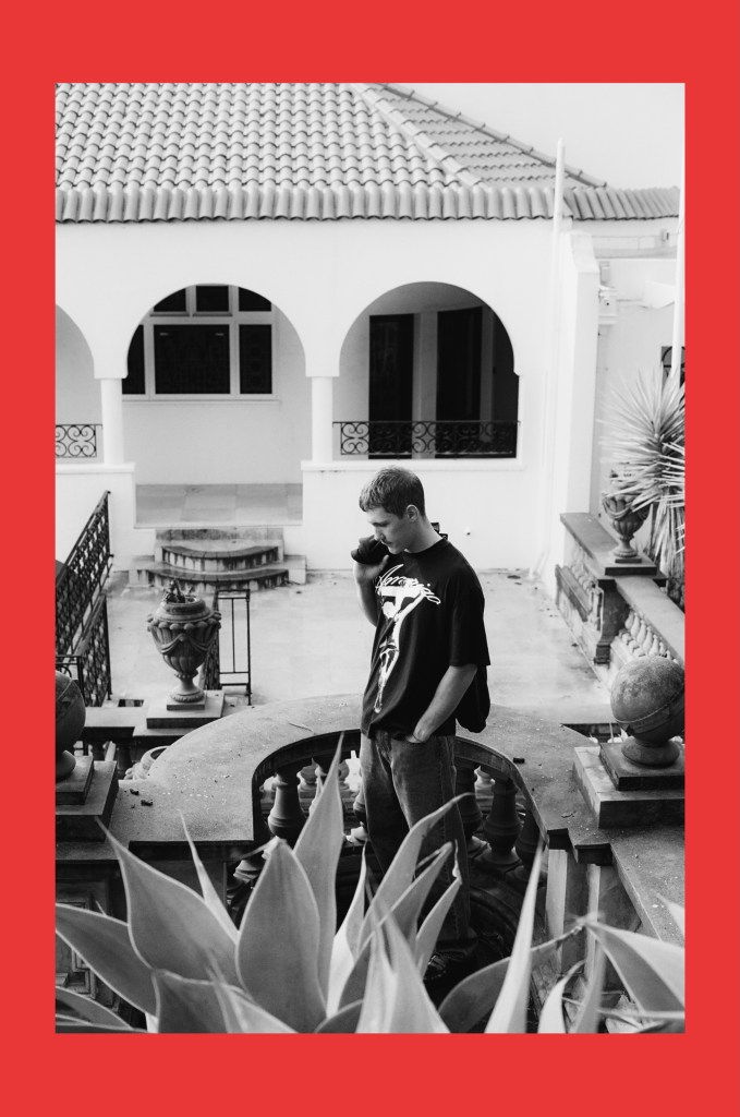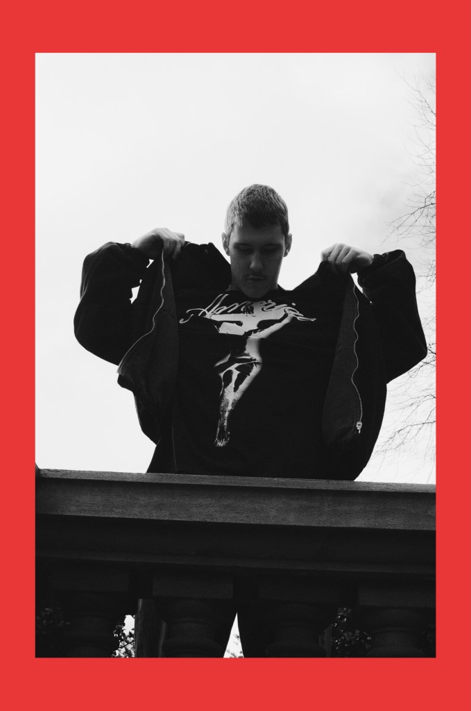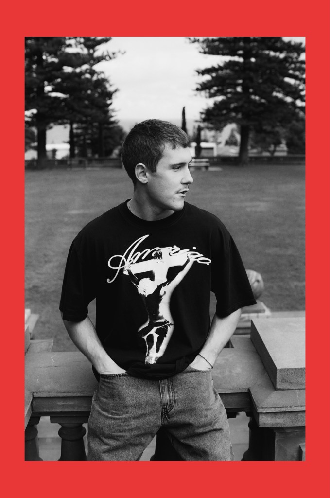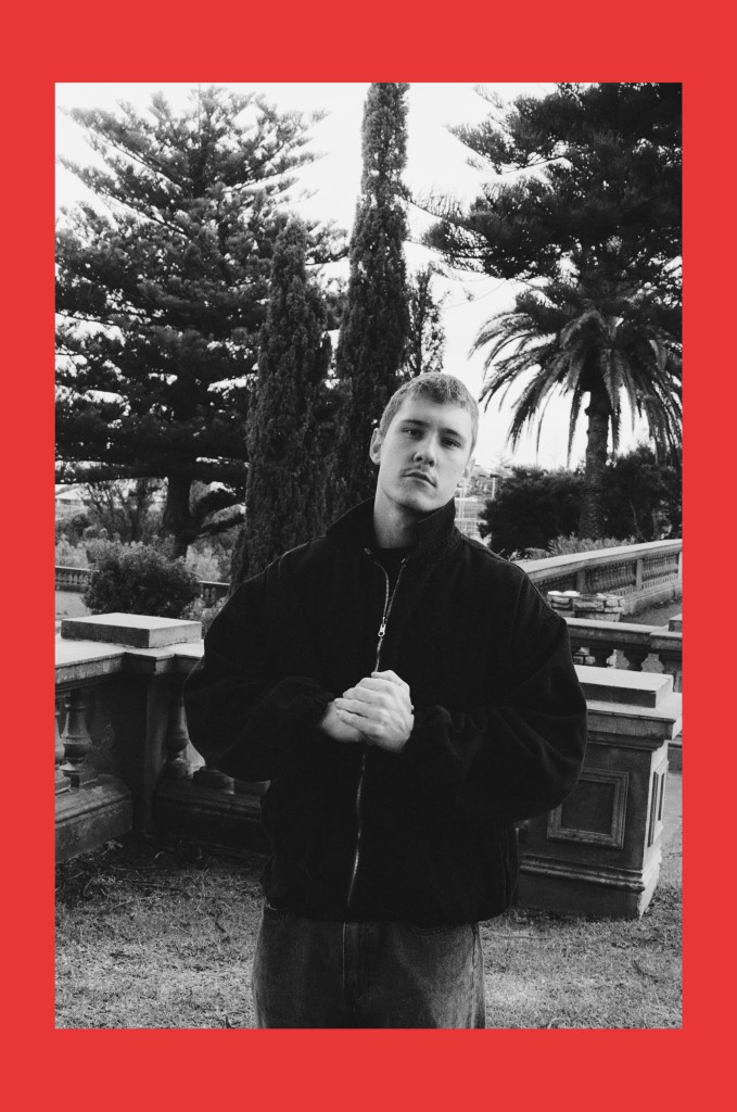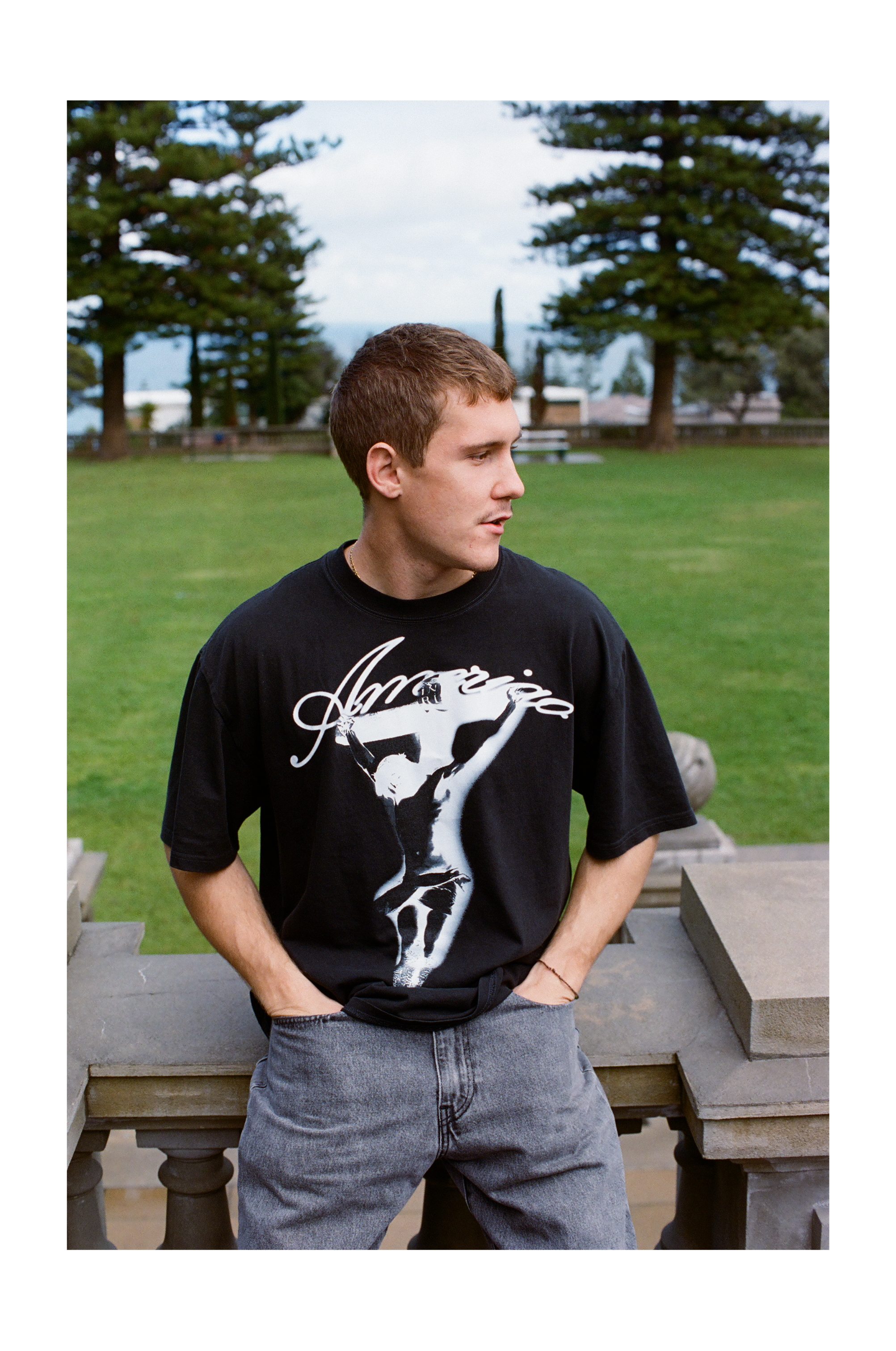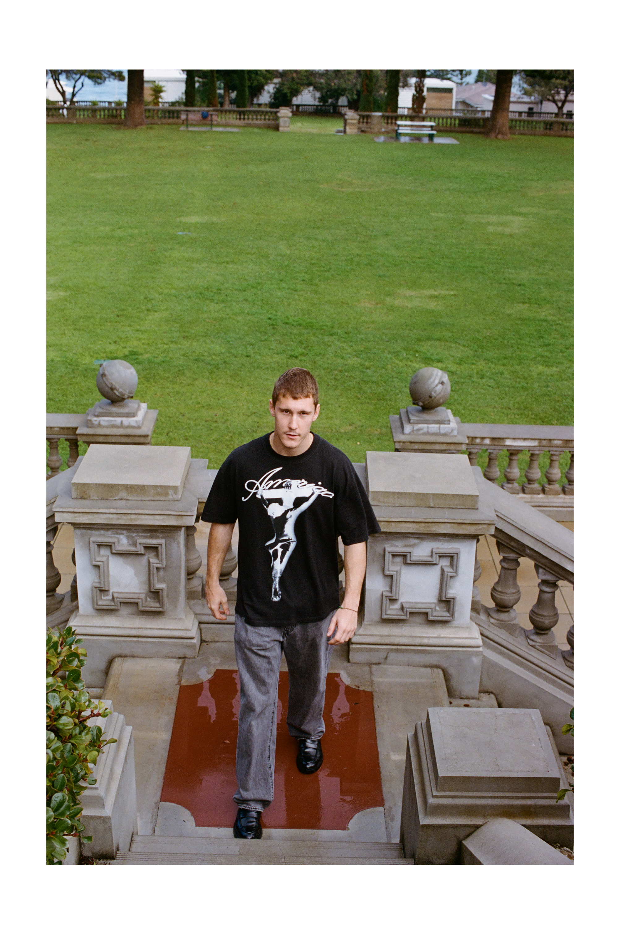 Shot outdoors in a public park, focusing on fit, proportions, and garment details in natural light. no post production, analogic.